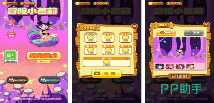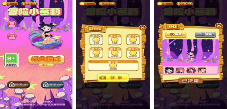 《冒险小萝莉》的主人公是一个可爱的小萝莉,主要玩法就是操纵小萝莉进行闯关,目前游戏内共有数十个不同形象的小萝莉,玩的时候可以自由选择。游戏除了提供丰富的武器装备以外,还有金币收集这个功能,而这些金币除了可以用于购买装备以外,还能够提升小萝莉的战斗能力,增加通关的概率。游戏画风卡通,色彩鲜艳的同时场景设计得也十分细腻!