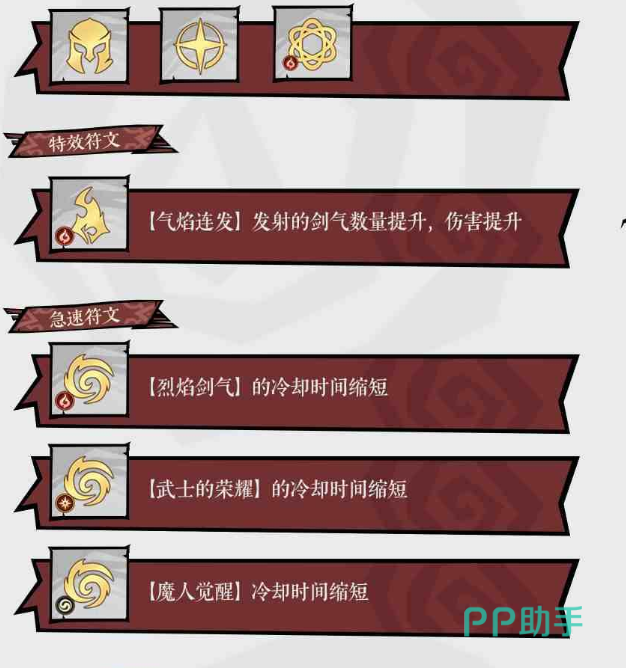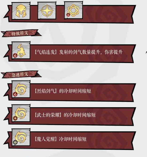 套装选择上,“巨型气焰”两件套即可带来32000%的基础伤害提升,性价比极高,无需强行追求四件套带来的冷却缩减。符文配置逻辑一致,优先满足核心增益。初始阶段可点选居合技能过渡,后期更换为血怒以提升续航。威能技锁定“气焰连发”。主宰技能前期推荐“烈焰残响”,待后续成型后因四件套收益偏低,建议更换为“风行者”以优化输出节奏。守护技能选择“光辉”,由于火系太刀需贴近敌人输出,该技能提供的近战加成尤为关键。