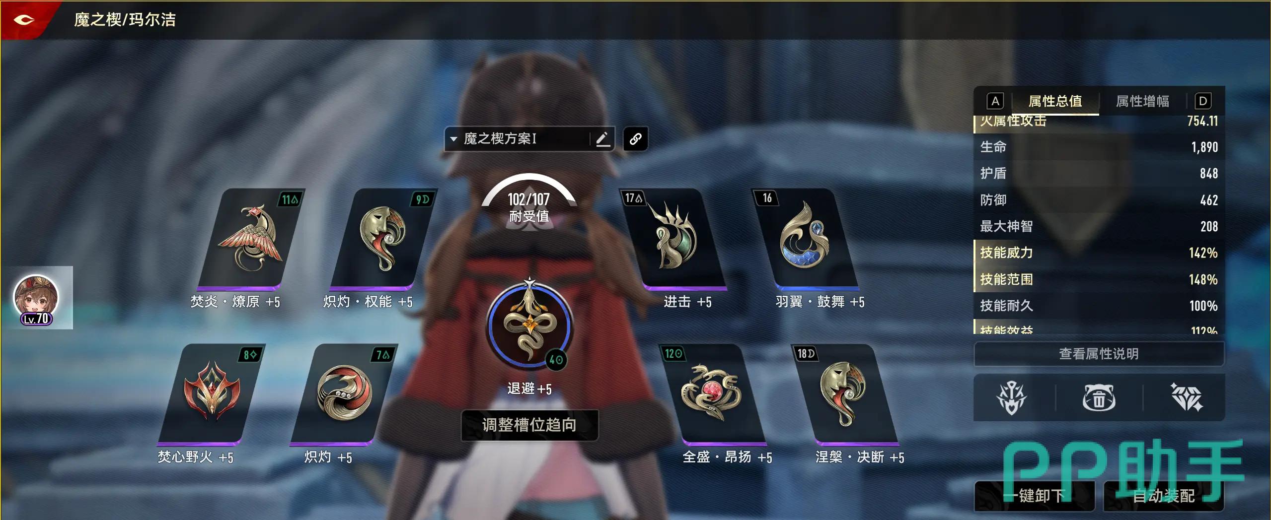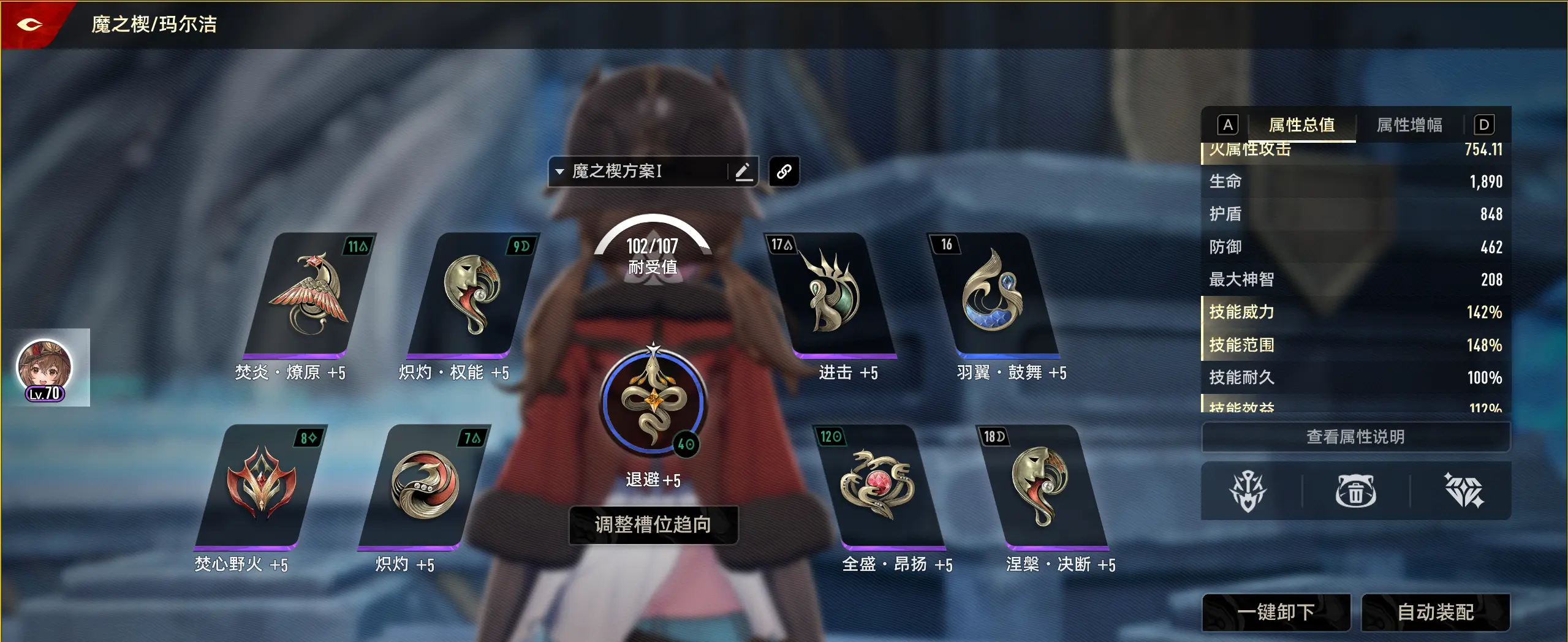 除了魔之楔配置外,队伍搭配同样关键。建议围绕火属性协同与续航能力进行组队,贝蕾妮卡和扶梳均能与玛尔洁形成良好联动,前者提供辅助支持,后者增强战场适应性。装备方面推荐使用元素套,以最大化输出潜力。