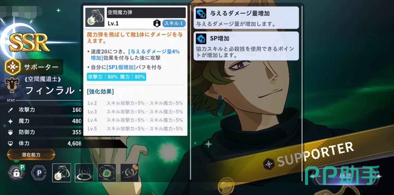 从基础属性来看,芬拉尔拥有160攻击力、480魔力、355防御力以及4608体力,符合高魔力辅助的典型设定。隶属于金色黎明阵营的他,定位为支援型角色,在SSR稀有度中具备极强的功能性。核心机制围绕空间魔法展开,主要为队友提供会心伤害提升与速度增益,虽然自身输出有限,但高额魔力值保障了技能效果的稳定释放。