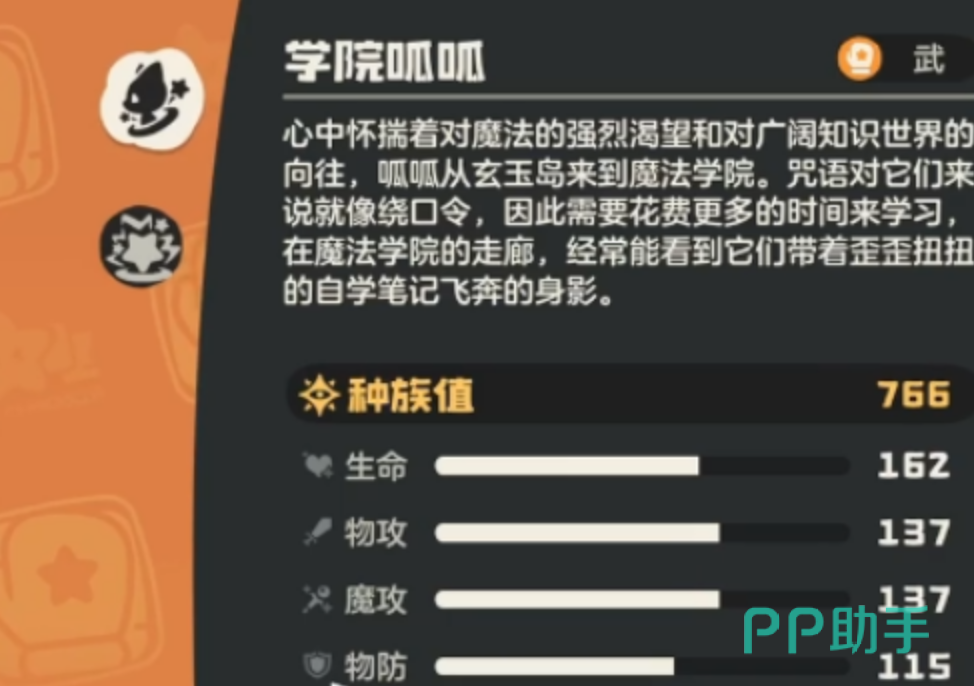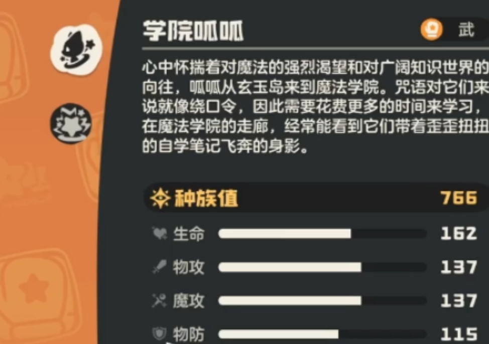 学院呱呱属于典型的多维适配型精灵,生命值、物理攻击与魔法攻击三项基础数值在当前版本中均位列梯队前列,使其既能承担中坚输出角色,也可在必要时兼顾前排承伤职能。物理防御与魔法防御维持在中等偏上水平,面对常规强度的单次普攻具备有效缓冲能力。其核心被动“留学生”为整套战斗系统定下基调:每次主动施放技能均需额外消耗2点能量。该设定显著提升了操作精度要求,能量调度合理性直接决定战局走向。与此同时,学院呱呱拥有全系攻击类技能学习权限,技能池覆盖广度为同类精灵之最,为多样化战术构筑提供了坚实基础。
