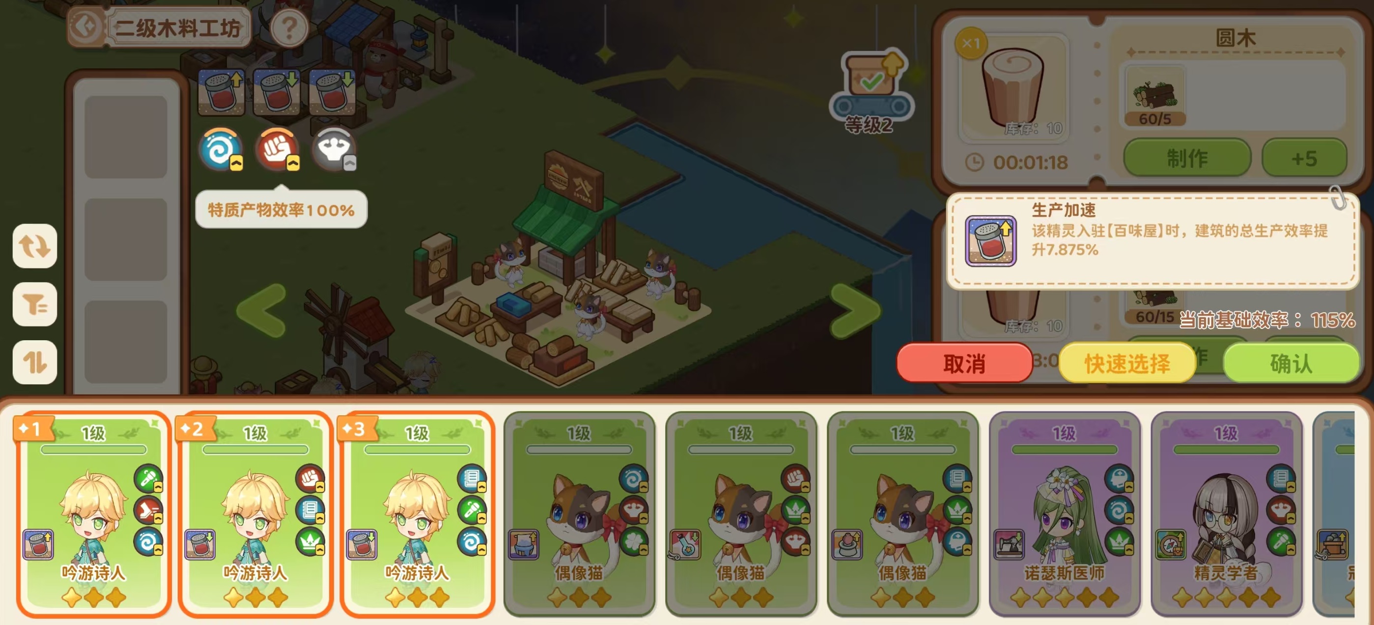 每只精灵在生成时自动绑定一项初始技能与三项随机特质。技能效果具有明确场景指向性:例如特定精灵参与普通料理制作时,可触发品质跃迁效果,将成品由“普通”提升至“优质”;另有精灵在钓鱼协作中扩大判定框范围达5%,显著降低操作容错门槛。特质则按红、蓝、绿三色维度划分,分别对应采集、制造、探索类工作环境。当精灵特质颜色与当前委派建筑/任务类型匹配时,将激活额外增益,形成策略性搭配空间。