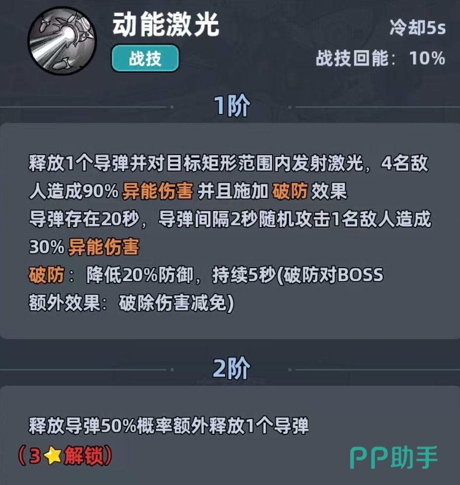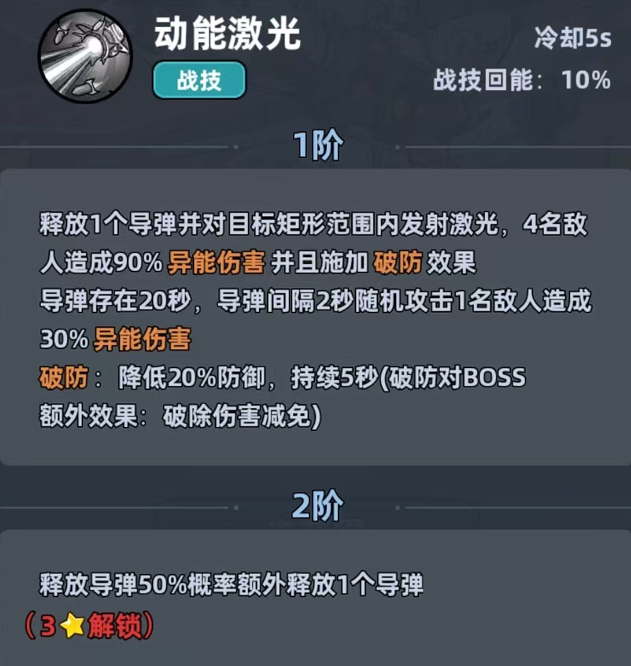机甲战士定位为双职能输出单位,既可承担主C职责,亦能有效补位副C位置。其核心技能为自动索敌导弹,每2秒对单个目标发动一次精准打击,单枚导弹具备破防效果,可显著削弱敌方防御属性;该技能持续时间达20秒,在整段CD内形成稳定DPS压制。配合被动破防机制,实际伤害转化率远高于同阶角色。