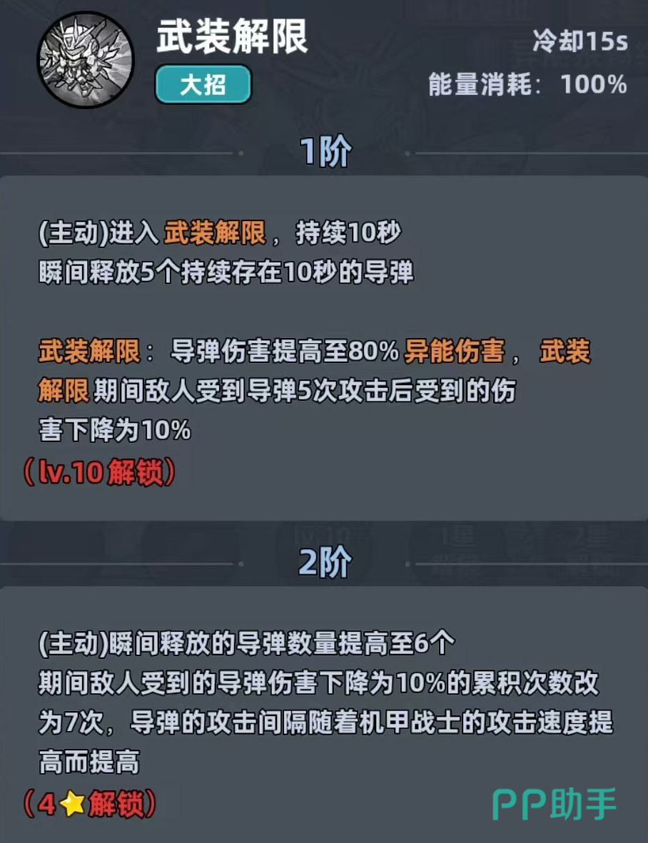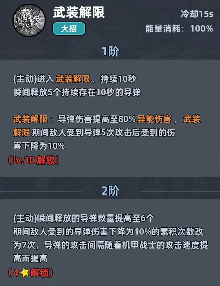 当释放终极技时,角色进入“武装解限”状态:一次性发射5枚强化导弹,且所有未发射的常规导弹均获得额外伤害加成。该机制大幅提升了技能衔接效率与瞬间清场能力,尤其适配新手开荒节奏与多波次小怪压制场景,是前期资源投入回报率最高的角色之一。