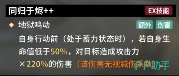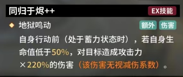 最后要提及的是角色的EX技能,叫做同归于烬,当角色自身行动前持有2层寂灭效果时便会触发,一方面会对目标造成机动力乘以攻击力乘以200%的固定伤害,另一方面角色会获得伤害吸收护盾,该护盾可抵挡2次普通攻击,且在受到多次普通攻击后消失。