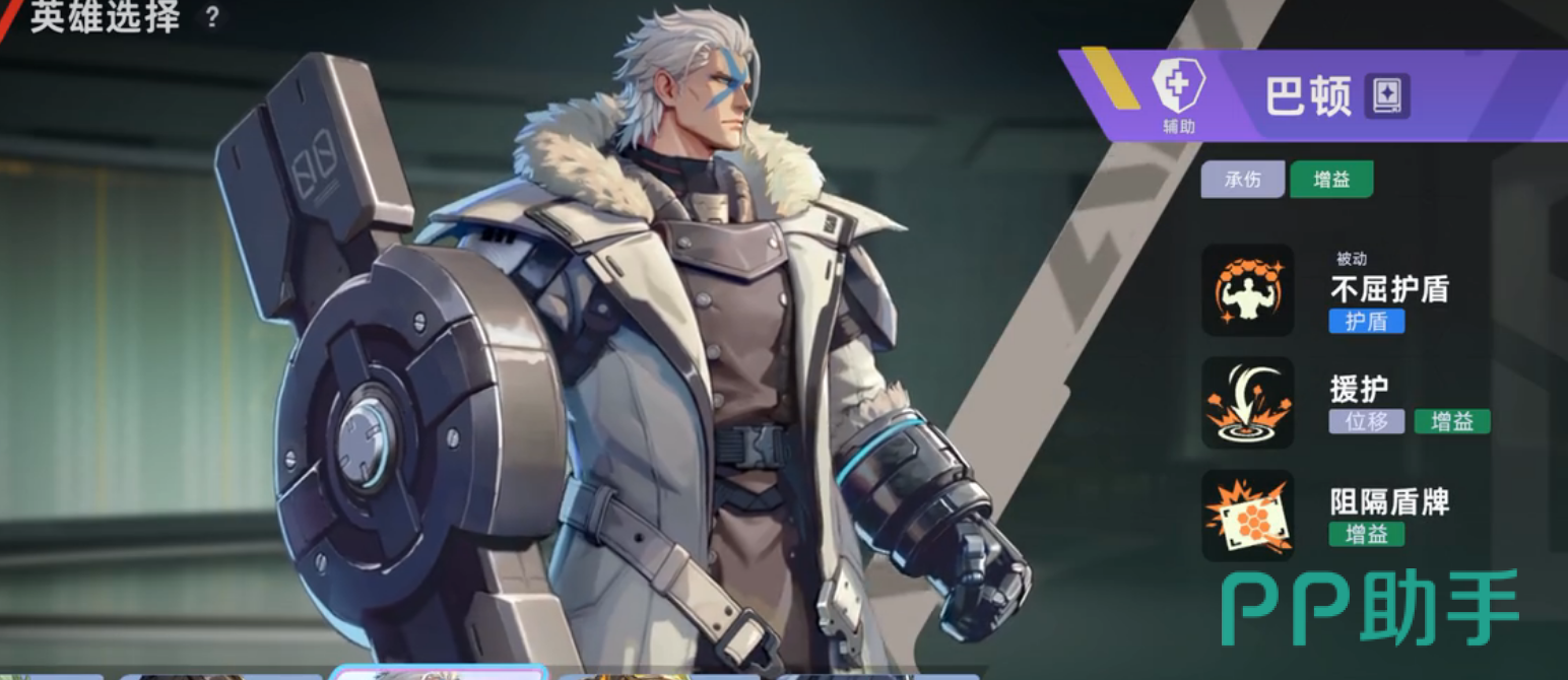 巴顿的核心战斗逻辑围绕“盾”展开:被动技能【不屈护盾】在角色被破甲时即时生成1500点护盾值,该数值远超常规紫色品质护甲提供的900点护盾加成,构成其高生存能力的基础;一技能【援护】兼具位移、群体击退与减伤三重效果,施放后为自身及周围友方单位提供持续3秒、强度达30%的减伤增益;终极技能【阻隔盾牌】具备完全拦截飞行弹道的判定机制,是反制狙击手、投掷物及远程火力压制的关键手段,兼具进攻扰控与战略撤退双重价值。