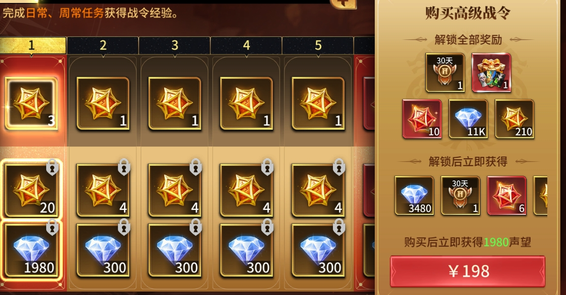 l 198元【集结战令】:聚焦英雄获取,提供大量【神魔召唤骰子】与【高级召唤骰子】,满级奖励为【五系英雄自选箱】,支持UR英雄自主选定。