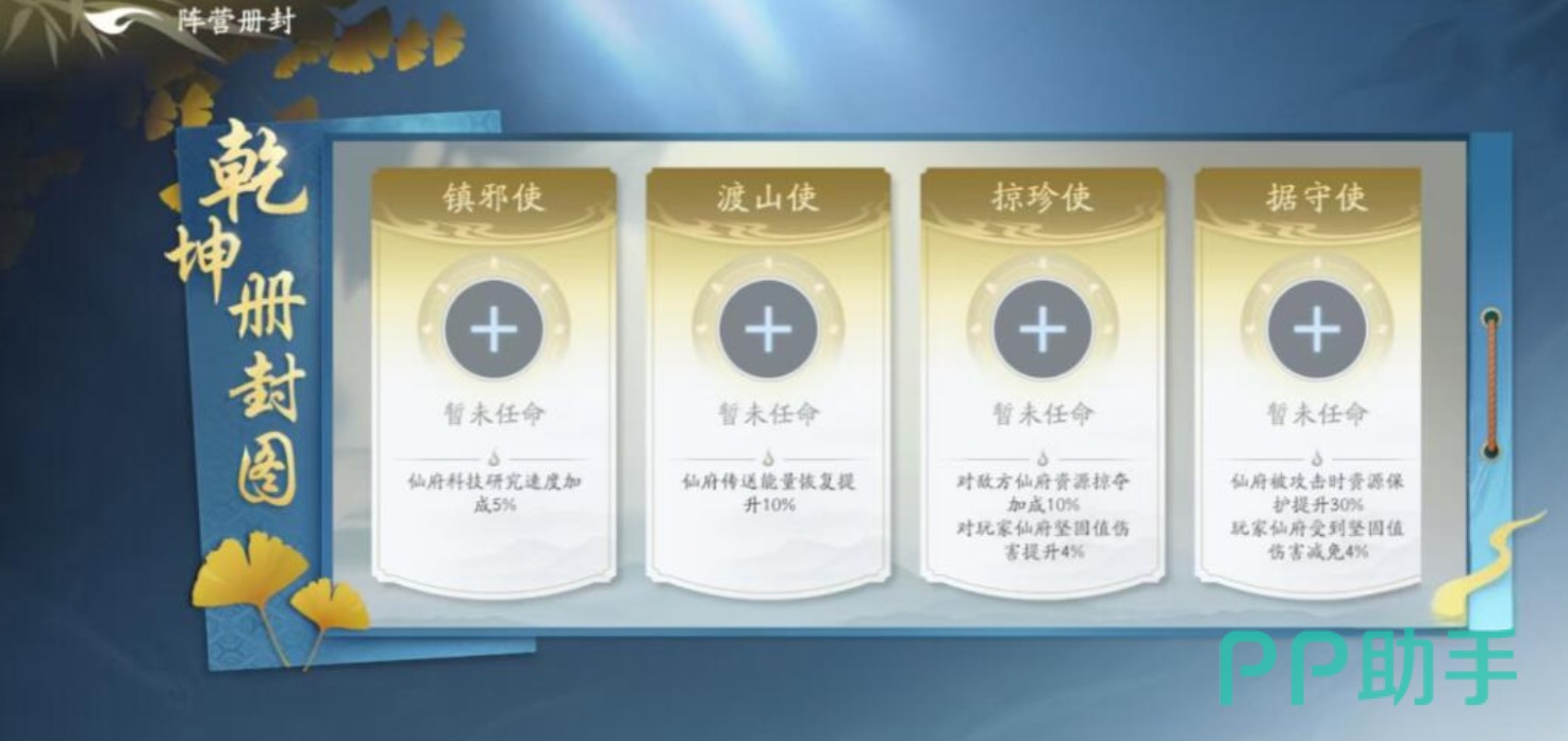 阵营法旨共设三类,功能互斥且不可叠加,需由圣主根据当前战略阶段择一启用:破军法旨强化仙门护山大阵耐久度,并提升全体成员对敌方护山阵法的伤害输出;司禄法旨直接作用于仙府生产系统,使源龙木、玄磁晶、星河砂三类核心资源的单位时间产量提升;衍息法旨则聚焦化龙池生态,同步加快化龙池能量恢复速率与传送阵充能效率。与此同时,乾坤册封图内设多重可授予职位,包括长老、执事、护法等,每类职位均绑定差异化属性加成(如攻击增幅、防御强化、资源加成等),所有成员均可通过贡献值竞争册封资格,从而获得持续性战力增益。