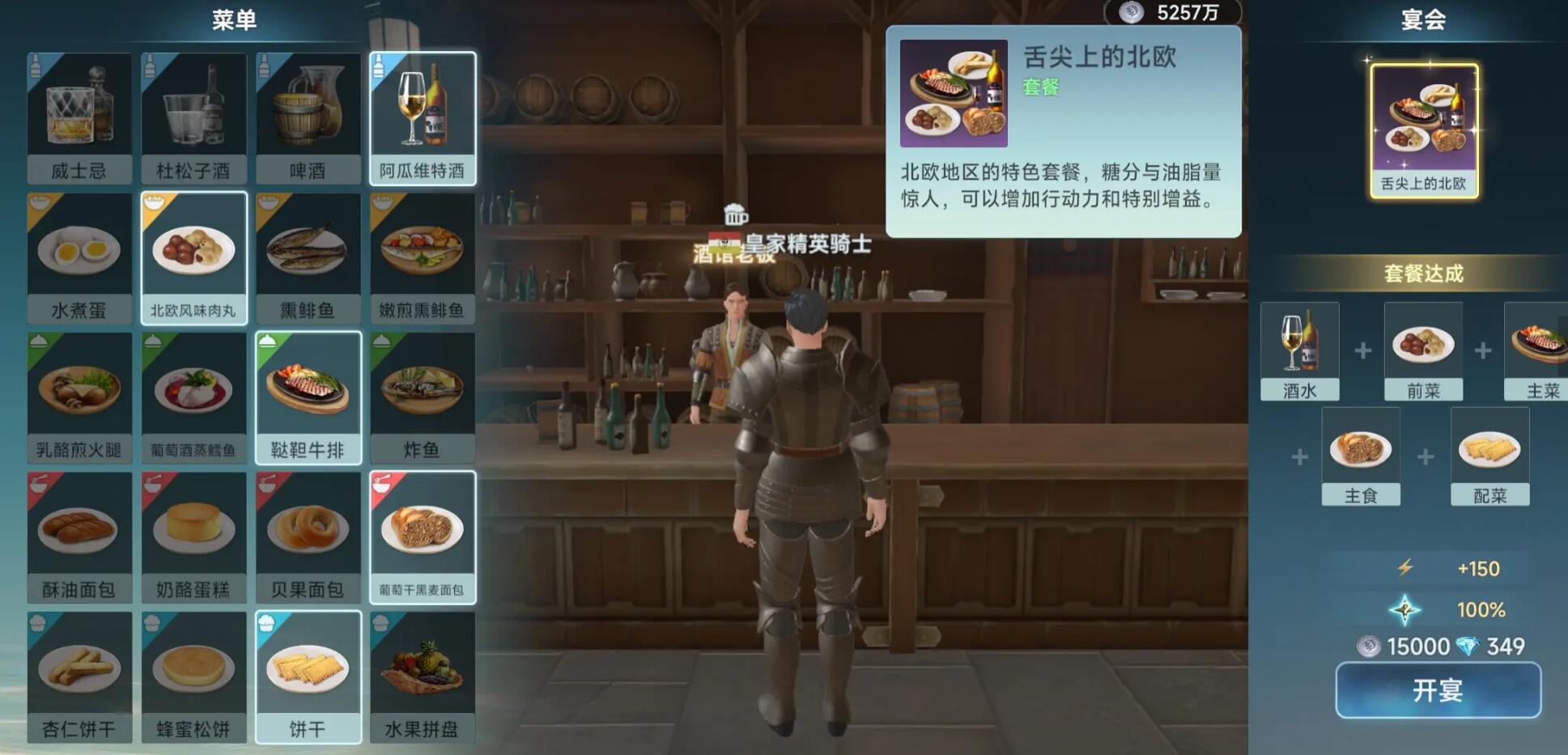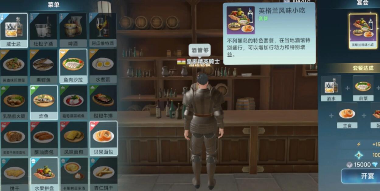 游戏中角色行动力也就是体力会因探索、战斗等行为消耗,需通过酒吧用餐补充。每个国家的酒吧提供5-6种菜品组合的套餐,单次用餐可恢复150点行动力,部分套餐附带暴击率提升、航行加速等增益效果。用餐需消耗“大餐券”或钻石,其中大餐券可通过商城促销(300钻/5张)或活动获取,性价比较高。若无餐券,需按菜品组合支付钻石,价格从98钻到248钻不等。