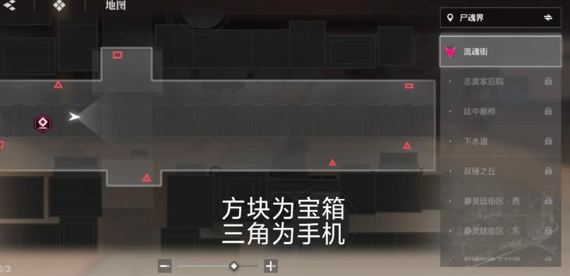 值得注意的是,《境界·刀鸣》在传统宝箱之外,还嵌入了更具叙事驱动性的“手机收集”机制。该玩法需前置完成露琪亚支线任务方可解锁。图示标识中:方块符号对应普通宝箱;圆圈代表第一阶段“现世篇”手机;三角形则指向第二阶段手机;而第三、四阶段手机均位于尸魂界区域,统称为“尸魂界手机”。明确三类物品的图标含义与解锁前提,是高效推进全图探索的关键。