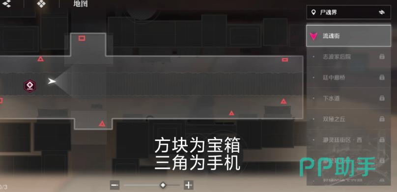 流魂街道呈线性延伸,图示从左至右依次排列,方块为宝箱,三角为手机,无圆圈标识,表明此区域仅含第二阶段及以上手机,需确保前期阶段已全部完成。
