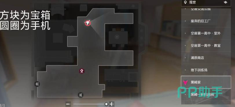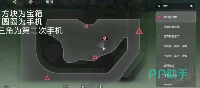 高台住宅地是现世篇首个重点探索区域。图中标注清晰:方块为宝箱点位,圆圈为第一阶段手机,三角为第二阶段手机,三者空间分布紧密但功能独立,建议按阶段顺序逐个确认。