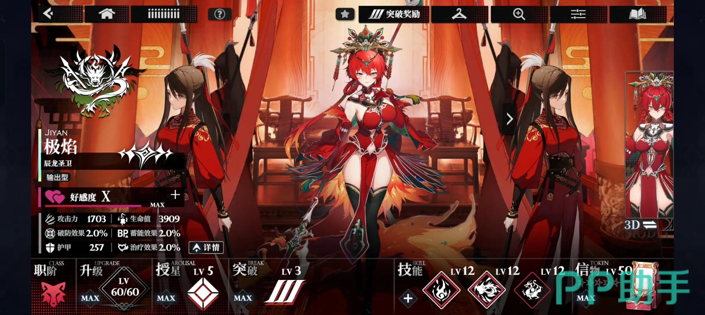作为目前唯一的限定五星输出型星痕,极焰在整体强度上远超其他同星级角色,是顶尖的单体爆发单位。她具备降低敌方灼烧抗性的独特机制,能够显著提升全队持续伤害的输出效率。其大招附带额外行动回合,在特定战斗场景下可实现惊人爆发。技能配置方面也极为丰富,拥有多个高倍率攻击技能。一技能对单个敌人造成165%攻击力伤害,并提升自身30%攻击力,获得一次闪避机会,同时进入业火状态。二技能对单一目标造成165%伤害,附加40%压制伤害加成,并回复50点能量,触发贯通形态。