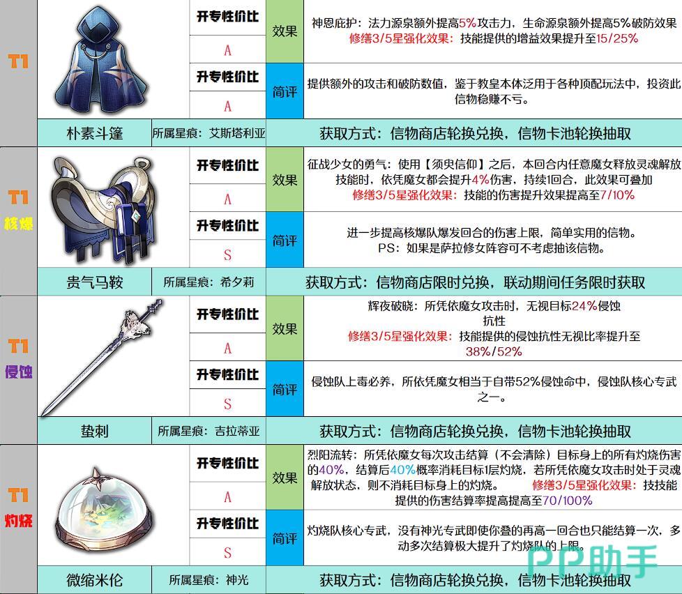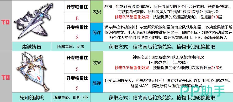 T0级信物具备跨体系适配性,是各流派的基础配置,虔诚祷告(萨拉)累计100能量即可获得充能,3星和5星时充能层数分别增至2层和3层,适配所有需要能量循环的队伍、先知的旗帜(耶坦尼娅)能无冷却释放引领之光,满专精可释放4次,大幅提升队伍辅助能力。这类信物优先级最高,可作为长期养成目标。