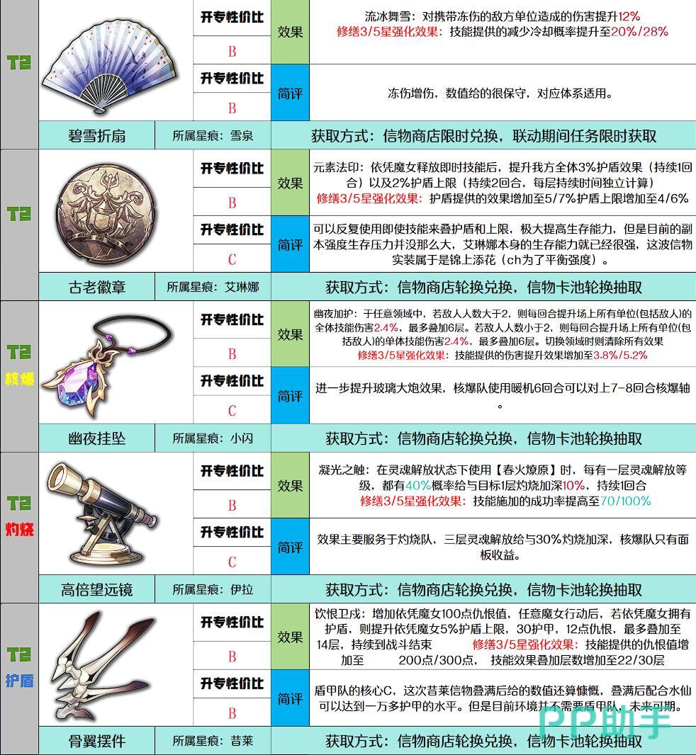 T2级信物仅适用于特定场景,泛用性较低。如碧雪折扇(雪泉)对带伤敌人增伤12%,仅推荐在冰冻队需要补充伤害时使用。其强度定位清晰,优先级低于T0和T1级,可在后期阵容完善后酌情配置。