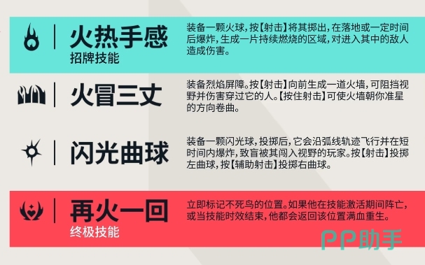 他的一技能,每回合拥有一次宝贵的使用机会,这一技能能够施放一道火墙,这道火墙它不仅能够有效地阻挡敌人的视野,让敌人难以窥探墙后的情况,还能对敌人造成30伤害,而他自己则是生命值恢复效果,不过由于火墙的距离相对较短,想要用它直接封住一条路并非易事,更多的时候,玩家需要巧妙地将其用在转角位或者门等关键位置,而且如果想要将火墙丢得更远一些,这里还有一个小技巧,那就是尽量让准星往上抬。