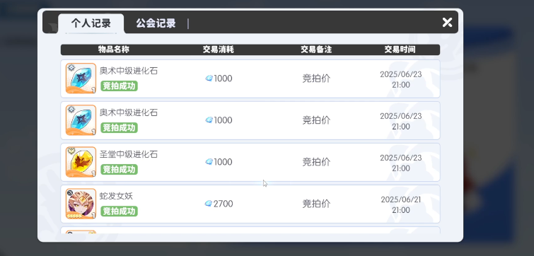 从实际兑换列表可见,拍卖行提供包括记忆结晶、龙魂精粹、五阶进化石在内的多种限定资源。其中进化石为角色突破关键节点所必需,市场流通量极低;记忆结晶则用于解锁高阶技能树,二者均为不可替代型成长物资。