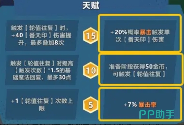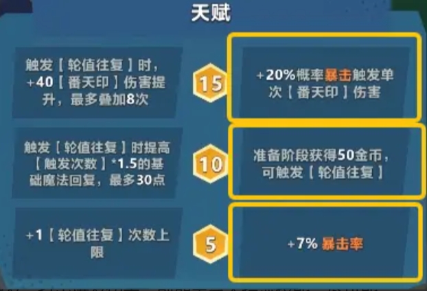 当15级的时候大家就要注意右边这个跟暴击有关的提升,虽然带来的是大招效果,但是输出伤害毕竟是提升了,而这一点也是跟上限的提升有关的,那魔法爆轰这个技能也是此时必选的,因为这样其实才会有暴击的循环效果,而且还能让殷郊在瞬间拥有超强的爆发力,在天赋的具体选择上,相比于增加轮值往复次数上限的选项,直接提升7%暴击率所会更好一些。
