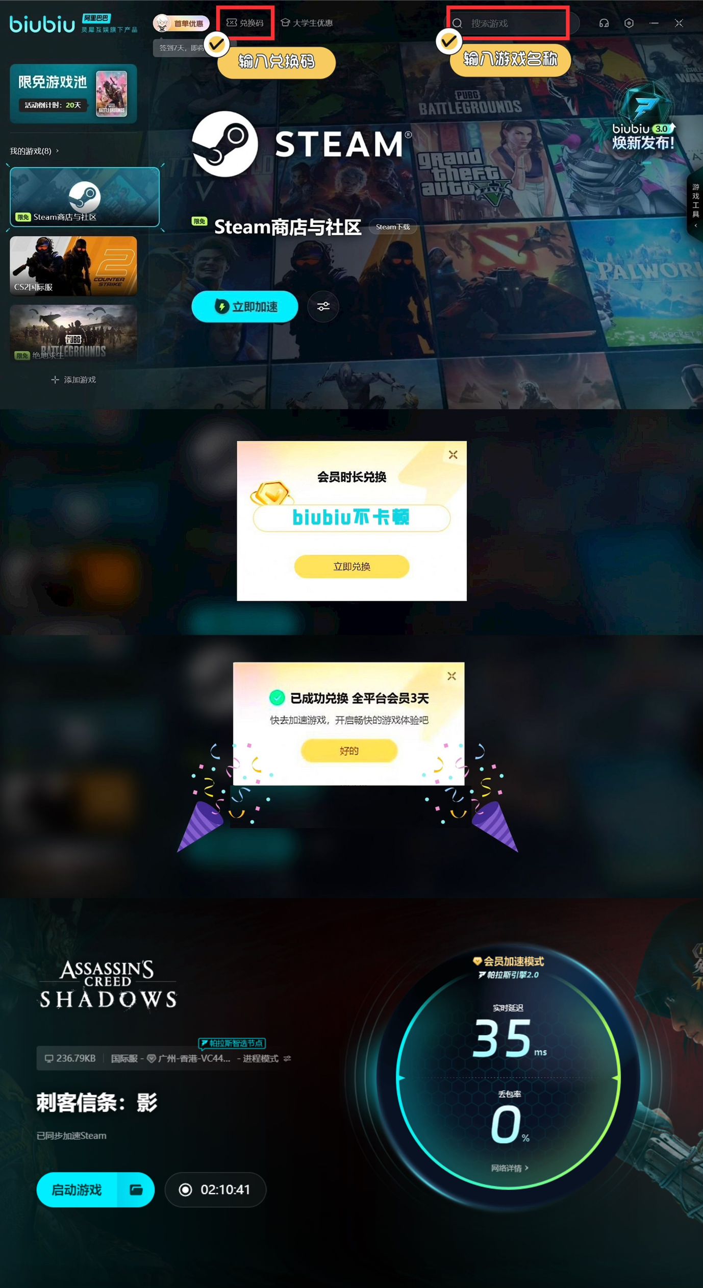另外当官方发布新的DLC内容或安全补丁时,就需要伙伴们即时的进行更新,来保证运行的稳定性和安全性。使用加速工具可以加快更新速度,有了它之后就可以减少等待时间。对于新用户而言,初次登录时还可以获得3个小时的免费加速权限。之后还可以与其他玩家一起使用兑换码【biubiu不卡顿】来获取额外的72小时加速时间。