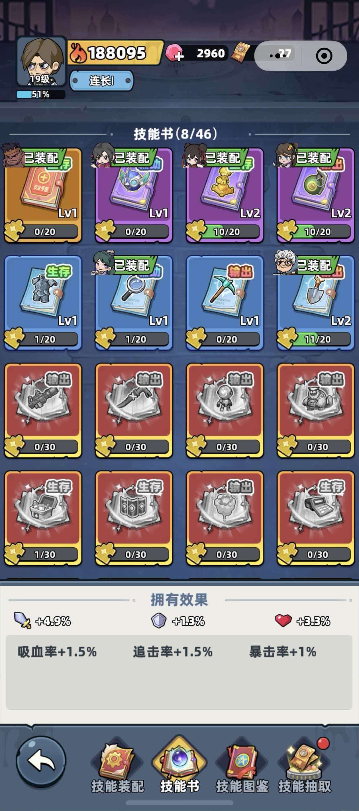 角色战力成长不仅依赖等级提升,技能书带来的属性加成与技能强化效果同样不可替代。当前游戏中技能书按功能划分为三大类型:输出型、辅助型与生存型,覆盖不同职业定位需求。品质体系采用五阶色阶标识——金红色为神话+级(最高品质),红色为神话级,橙色为传说级,紫色为史诗级,蓝色为精良级。品质差异直接决定技能效果强度、附加属性数值及适配角色上限,务必结合英雄定位选择对应类型与品质的技能书进行装配。