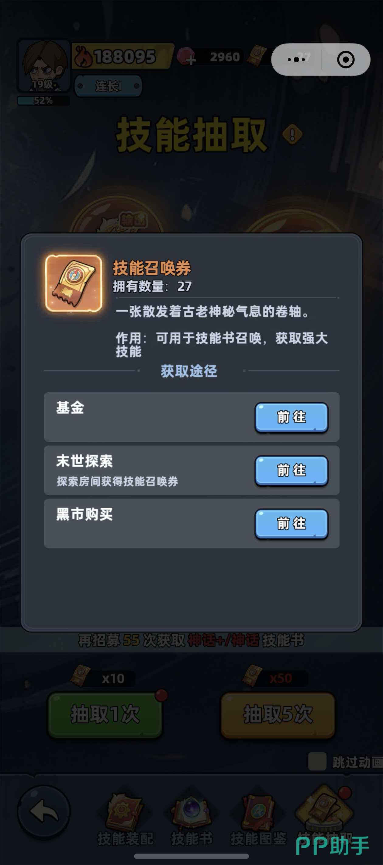 技能书的解锁方式共有两种稳定途径:技能召唤券抽取与场景探索直获。其中,技能召唤券是定向获取技能书的核心道具,可通过三种常规渠道获取: 一、技能书基金——开通后,每完成一次角色进阶,即可领取固定数量的指定技能书奖励; 二、末世探索——在世界地图中,识别带有“开启门”图标的房间并进入探索,有概率获得技能召唤券; 三、黑市交易——在“更多”界面进入黑市,使用钻石购买技能召唤券,单价为150钻石/张。该方式成本较高,建议资源充裕后再行考虑。