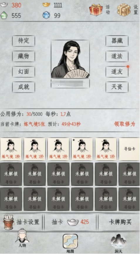 区别于传统修仙手游的繁复操作,《挂机鉴仙》采用“卡牌即修为”的创新设定:每张卡牌自带基础修为值与隐藏天赋,需通过“鉴定”动作激活属性,过程随机性强、反馈即时,类似沉浸式盲盒体验。游戏内置秘境闯关、伙伴采集、炼丹炼器等经典修仙模块,并融合每日悬赏、资源商店与离线收益系统,确保单机环境下成长节奏清晰可控、目标明确可期。
