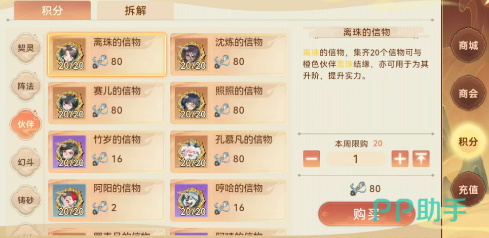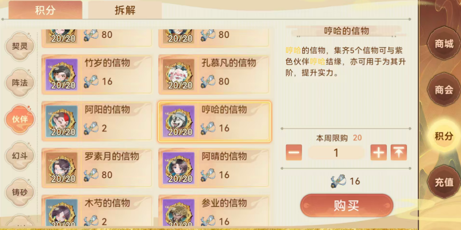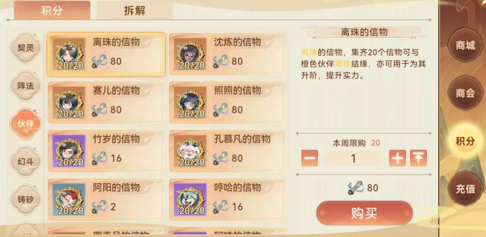 除结缘外,信物还承担着伙伴升阶的核心消耗职能。随着角色等级提升与星级进阶,所需信物总量呈阶梯式增长。因此,中后期培养重点伙伴时,需提前规划信物储备策略。若某位伙伴不再纳入主力阵容,其已获得的信物支持拆解操作,可转化为通用货币,用于商城内其他资源兑换。当前版本中,所有伙伴信物唯一获取途径为“商会”系统,暂无副本掉落、活动赠送等替代渠道。