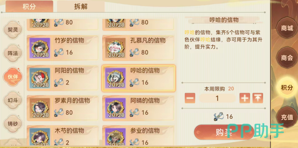 信物按所属伙伴进行区分,每类信物均冠以对应角色名称前缀,属于专属收集型资源。当玩家累计获取指定数量的某位伙伴信物后,即可触发“结缘”机制,正式解锁该伙伴的出战资格。需注意的是,不同品质伙伴对信物需求量存在显著差异:蓝色品质仅需1枚即可结缘;紫色品质需集齐5枚;而橙色品质则要求达到20枚方可完成结缘。这也意味着高稀有度伙伴不仅战力更强,其养成门槛也相应提高。