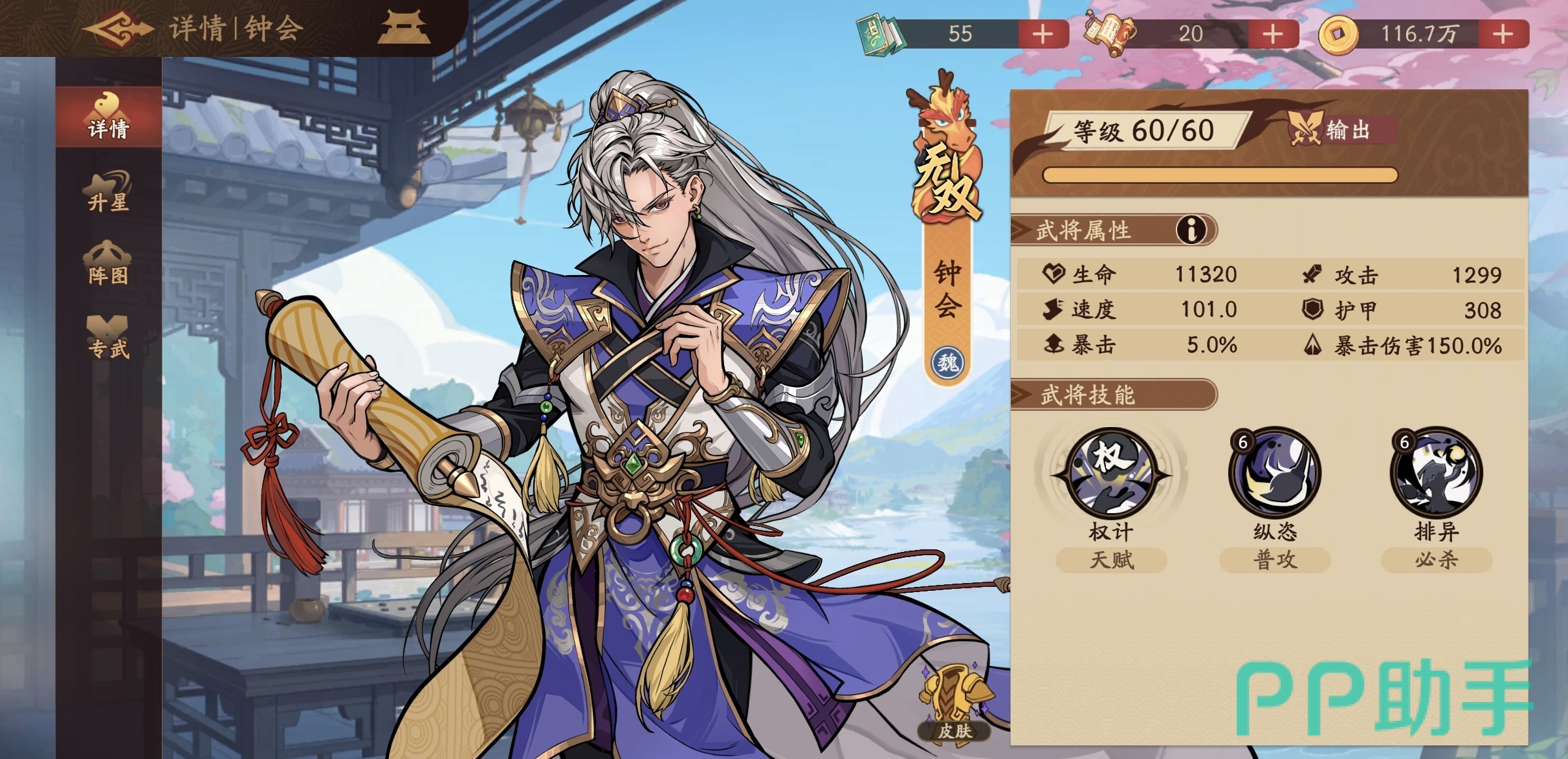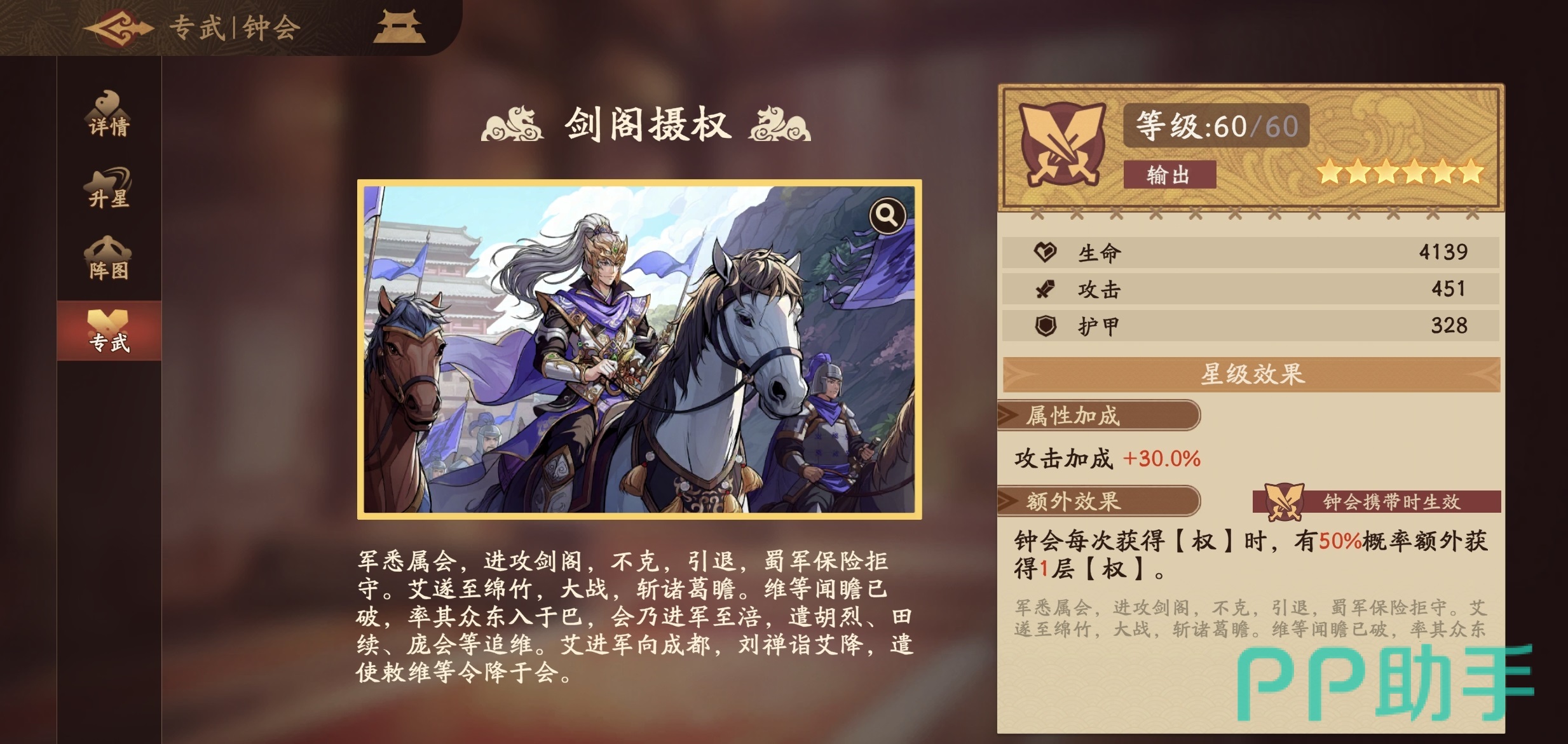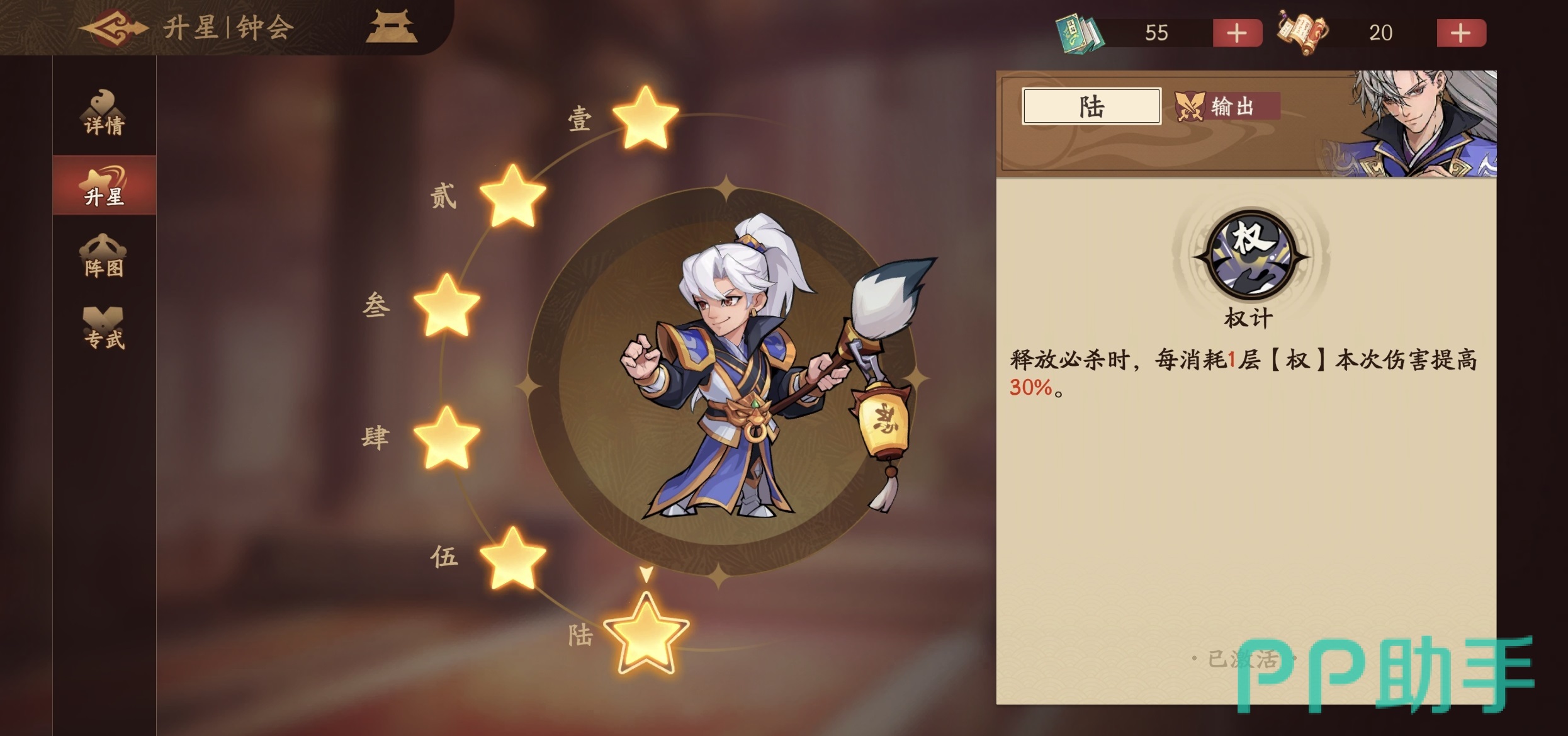 钟会的核心输出逻辑围绕“权”状态展开:普通攻击有概率获得1层“权”,受击时亦可稳定获取1层;每层“权”提供5%暴击率加成,上限为10层。其终结技需消耗全部“权”层数,对敌方前排目标发动高额单体伤害——消耗层数越多,基础伤害越高。当武将星级提升后,若终结技消耗权层数达5层及以上,将触发“无视部分护甲”效果,大幅削弱前排坦克单位的生存能力,实现高效破阵。