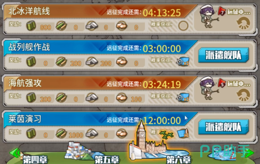 在第七个章节里面总共有四个关卡,每个关卡所耗费的时间以及玩家的舰船等级都不一样,在第七章的第一个关卡里,玩家需要消耗十个小时,并且需要期限等级在40以上,所耗费的舰船数量最少要四个,还需要有一个航母和一个重巡,完成任务之后,玩家就可以获得600铝材。