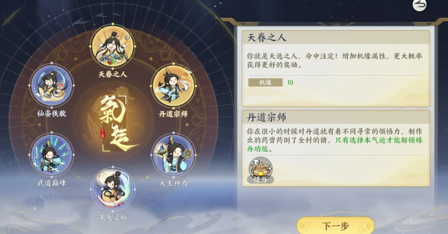 如若玩家选择天眷之人,那么基础的机遇属性值会增加十点,若玩家选择丹道宗师,那么可以获取的炼丹数值就会更高,建议新手玩家,在游戏初期,直接选择丹道宗师,增加自己获取丹药的概率。
