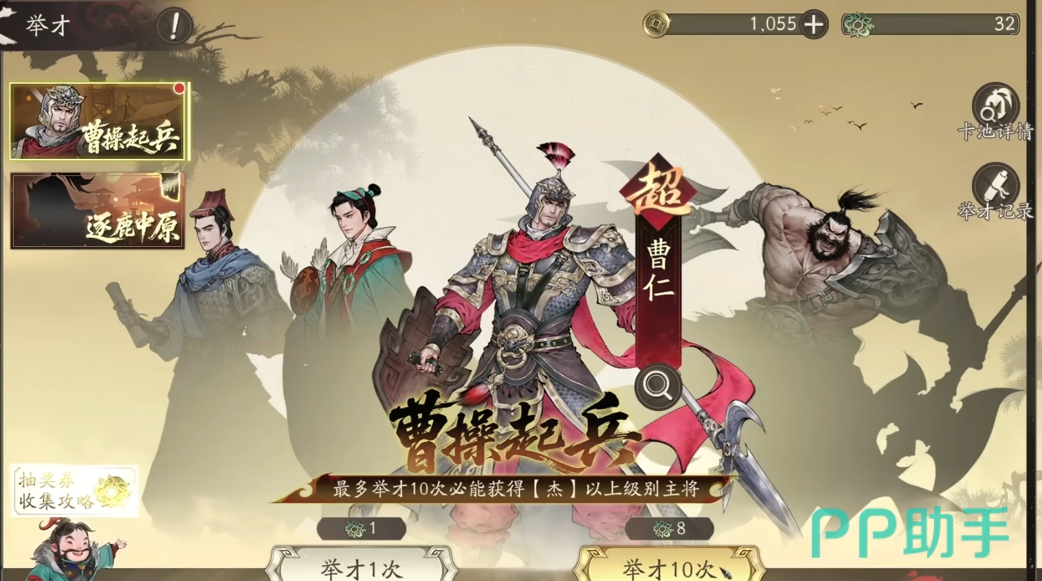 游戏内的卡池主要分为三类:新手池、武将限定池和武将常驻池。从性价比角度来看,新手池无疑是首选。该卡池提供八折抽卡优惠,并设有五十抽必得超品武将的保障机制,意味着玩家最多只需消耗40抽即可稳定获得一名可用于开荒阶段的核心武将。此外,池中包含如程昱等适用性广泛的武将,不仅能助力前期主线推进,在后期也能与限定超品形成有效配合。因此建议新人玩家优先完成新手池抽取,在确保拿到保底超品后再考虑其他卡池。