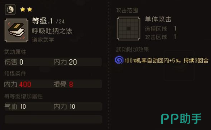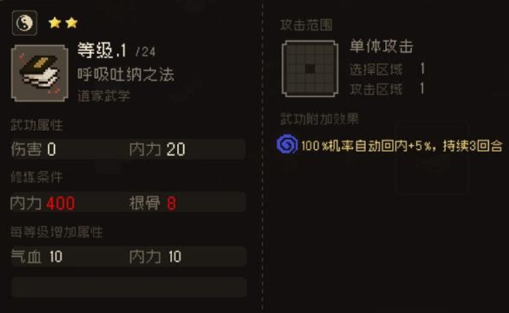另外就是四书心经,这也是游戏里的一个奇门武学,所属的是道家武学,这个武学的修炼要求和呼吸吐纳之法一样,只不过攻击区域相对来说会更大一些,而且能提升玩家的轻功,使用之后可以连续持续三个回合,获得这个武学的话就需要去三斗坪水道,在这里会遇到一个江湖郎中,可以直接和这个郎中对话购买。