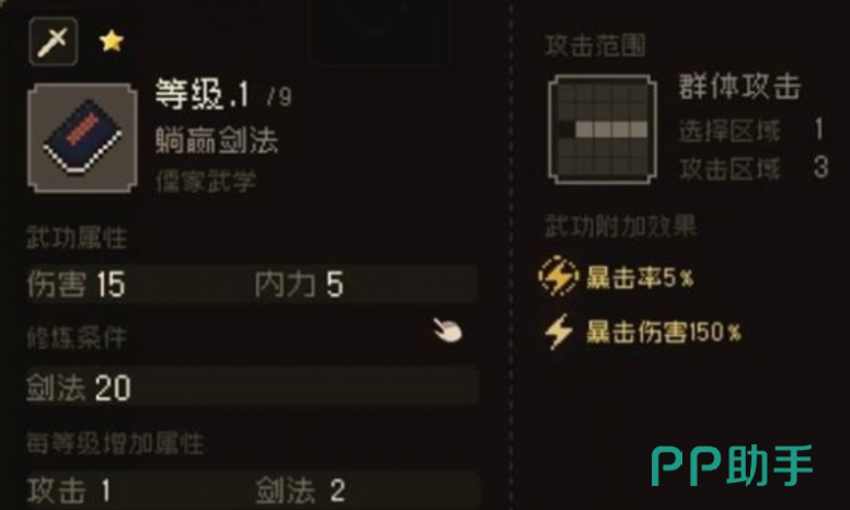 游戏里暂时只有这三项奇门武学,每一个的获取难度都是比较低的,本身武学的等级不高,所以修炼没有太高的要求,只是武学整体的攻击范围也是比较小的,如果玩家想要在游戏里有更加优秀的战斗能力,那就可以去学习各种剑法,比如在杨太傅庙这里可以学习到躺赢剑法,这个是一个群体攻击剑法,只要玩家让自己的剑法数值达到20就能修炼。