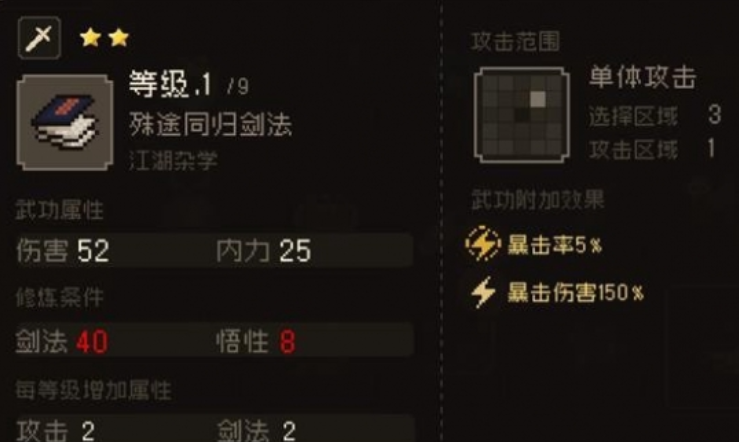 另外在江湖郎中那里还能购买四书剑法,这是一个等级相对比较高的儒家武学,玩家需要让剑法达到40,身法达到8,这样就可以顺利修炼武学,能提升暴击率和暴击伤害,对战过程中也是大范围的群体攻击。在江夏渡口酒楼这里,会涉及到主线剧情的选择,如果玩家选择的是江湖线,那就可以直接获得江湖杂学殊途同归剑法,这个剑法虽然是单体攻击,但是能带来巨大的暴击伤害。