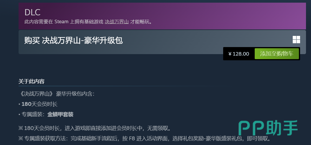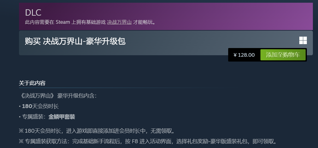 目前,《决战万界山》已正式登陆Steam平台。游戏本体为免费下载,玩家可零门槛进入体验核心玩法。若希望在开局阶段获得更丰富的成长资源与视觉标识,官方提供了“豪华升级包”,售价128元。该版本包含6个月会员权益及限定外观“金鳞甲套装”,所有内容均为外观与服务类增值,不涉及战力数值加成。
