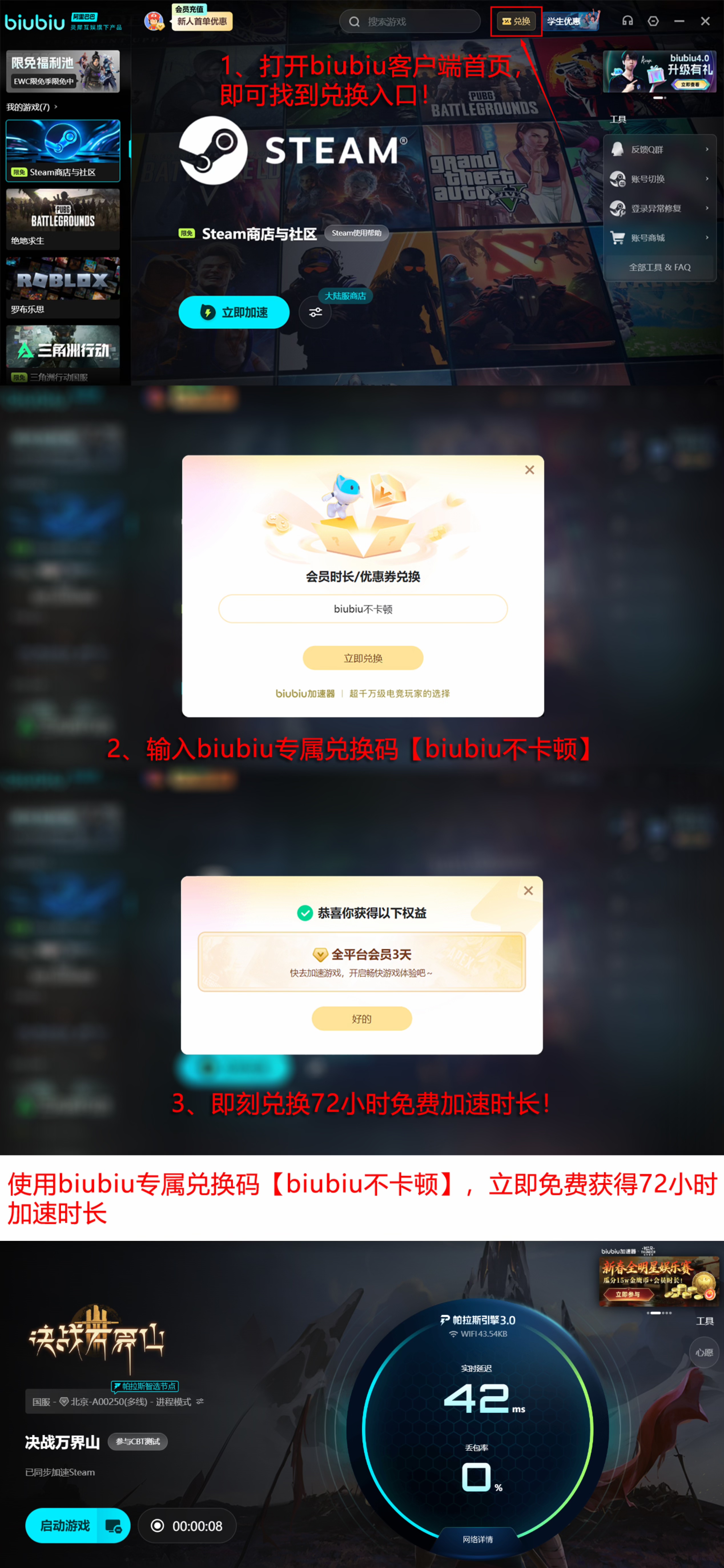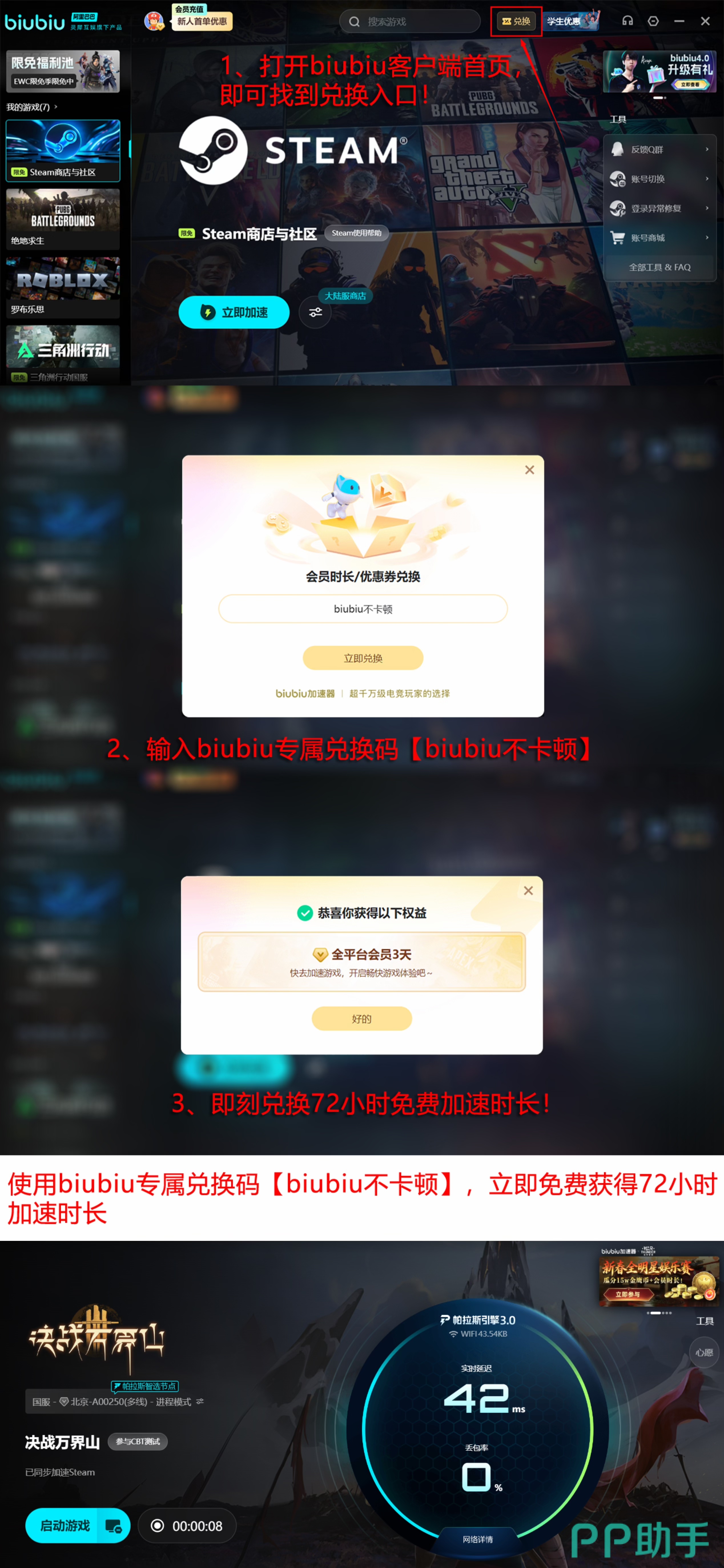 新用户注册即可领取24小时全游戏加速时长;所有用户(含老用户)均可通过活动入口【biubiu不卡顿】兑换3天通用加速权益。