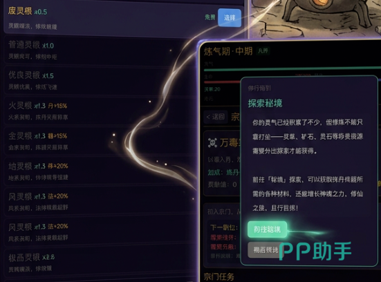 进入修仙世界后,所有修炼行为均支持后台运行。灵气持续自动积攒,达到阈值即触发境界突破——从炼气期、筑基期、金丹期逐阶晋升。每次成功突破,角色基础属性(如生命上限、灵力总量、灵力恢复速率)将获得固定提升,战力呈阶梯式稳定增长。资源紧缺时,可开启秘境探索模块:全程采用纯文本交互形式推进剧情,无地图走位、无实时战斗,仅需点击选项即可获取灵石、功法残卷、丹方等初期必备资源。