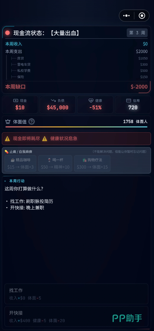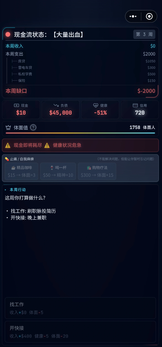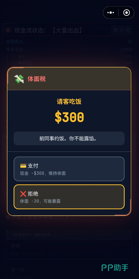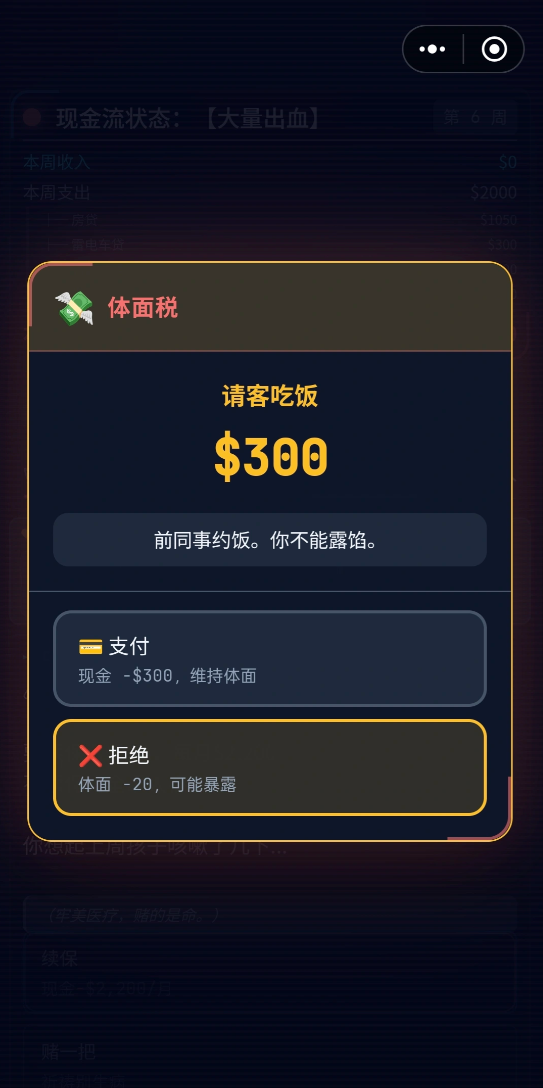 游戏中存在多种突发性经济压力事件,例如图示中的“体面税”,若未及时投入资源维持角色社会形象,一次看似普通的“约饭”交互也可能直接引发角色坠入“斩杀线”的结局分支。针对此类高风险情境,本期提供三组通用型兑换码:VIP666、VIP777、VIP999。每组仅限单次使用,请优先用于核心生存类需求,避免消耗在非紧急事件(如阅读报纸、低风险社交)中。
