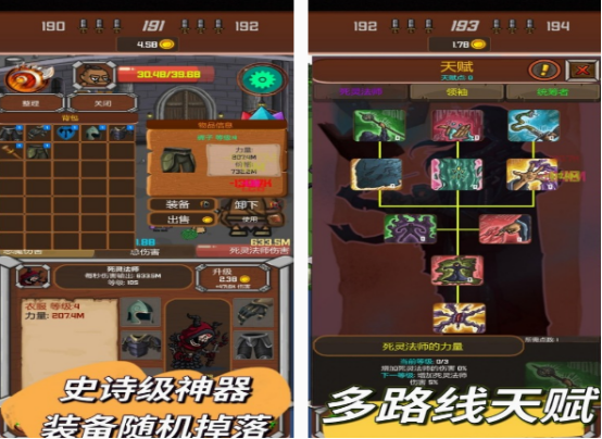 相对于比较大型的暗黑游戏,这款属于小型的游戏类型,但依旧能帮助你置身于暗黑的环境中。面对恶魔的时候,需要与其作战,游戏设置了超多史诗级的神器,通过得到这些神器以及随机掉落的装备以后,可帮助你在不同线路当中,获得不一样的天赋。属于颠覆传统点击挂机类型游戏特色内容的,要注重对英雄属性提升。