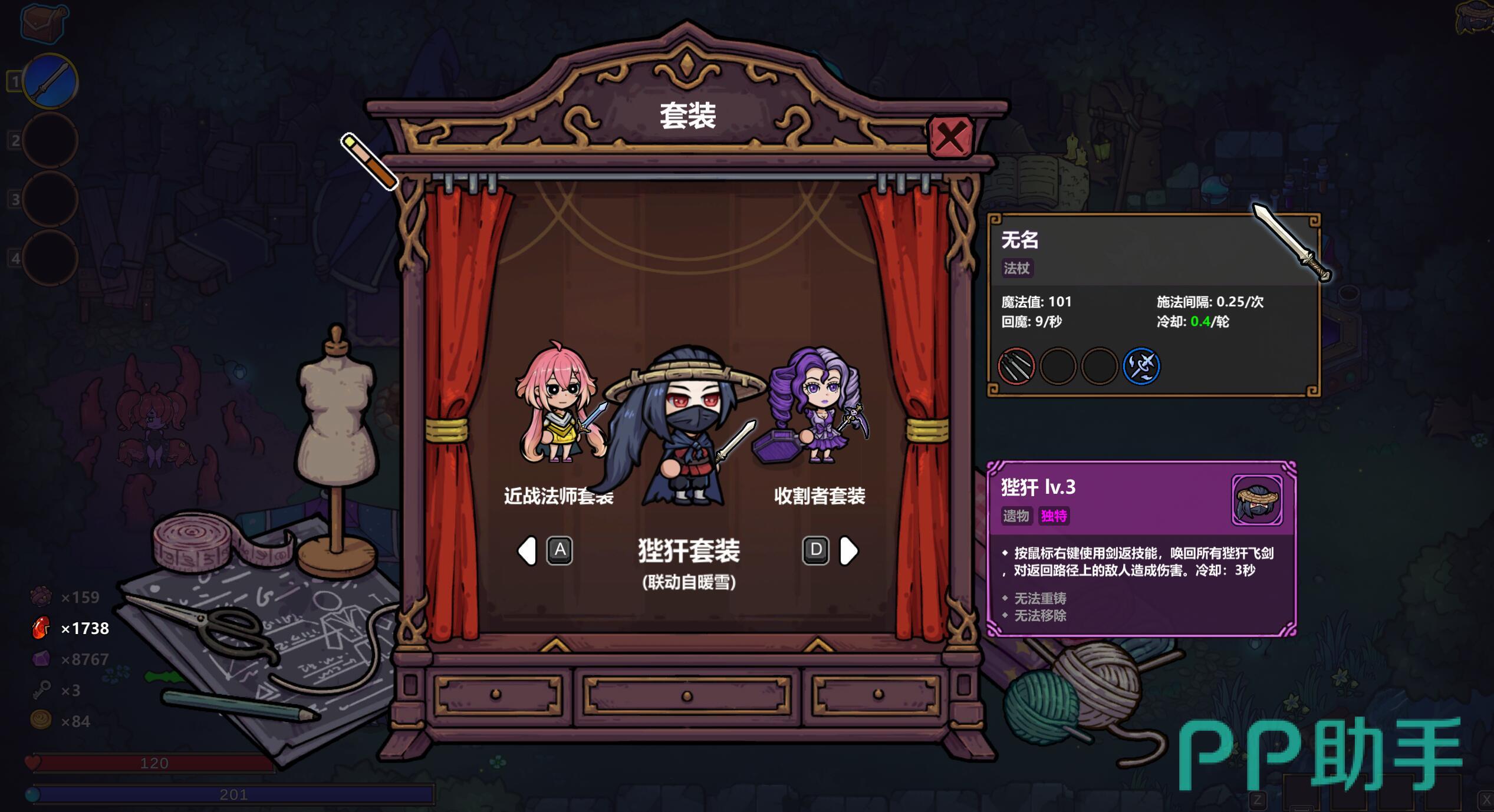 装备搭配上首选暖雪联动套装,该套装会将初始法杖替换为无名剑,其专属技能“剑返”对精英单位造成极高爆发伤害,常可实现一击斩杀,避免陷入持久战。若未获得此套装,背包乱斗收割者套装为次优解,其自动整合背包内法术的机制有效减少在商店整理技能的时间消耗,建议在刷新池中优先锁定。遗物选取应遵循:回能类>增伤类>生存类的优先顺序,确保能量循环流畅。