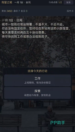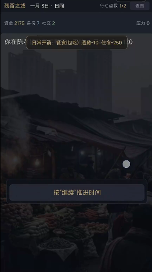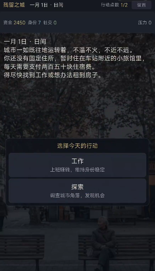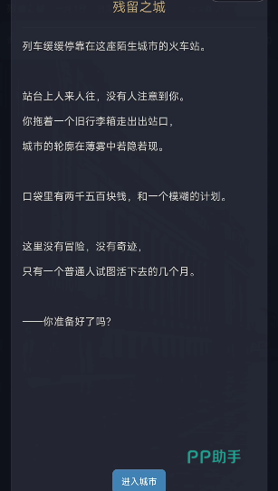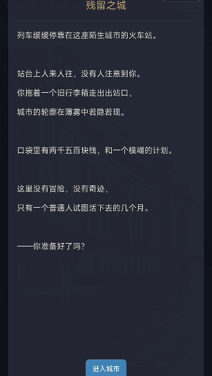 《残留之城》公测时间尚未正式公布,官方暂未披露具体上线日期。作为一款风格独特的文字冒险类游戏,本作以沉浸式叙事为核心,玩家将通过纯文本交互体验多线人生——从初抵陌生都市的拮据开局,到在生存压力下做出关键抉择,逐步揭开城市表象之下层层掩藏的真相。游戏机制强调“压力反馈”与“循环残留”,每一局以一年为周期,玩家的选择会以记忆碎片形式延续至后续周目,形成深度绑定的成长轨迹。