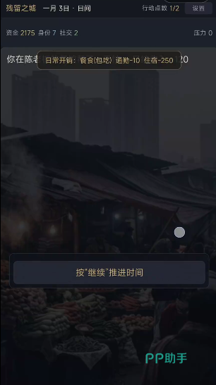 系统设计多重压力源——经济赤字、时间短缺、社交信任度波动等要素实时影响角色状态。所有决策均非孤立存在,“残留”机制使前一周目的关键行为、关系倾向与隐藏线索,将以隐性方式渗透进新一轮循环,构成三周目递进式叙事结构:第一周目聚焦现实生存逻辑,第二周目引入异常征兆与人物背景伏笔,第三周目则全面转向悬疑解谜,直指城市核心秘密。