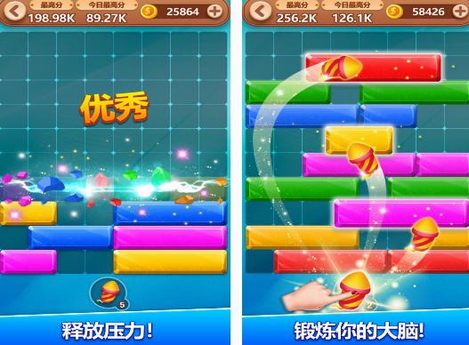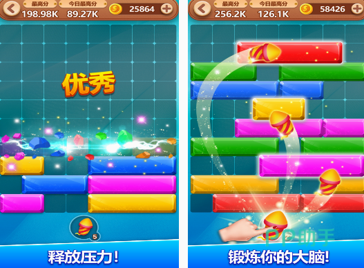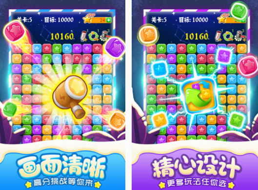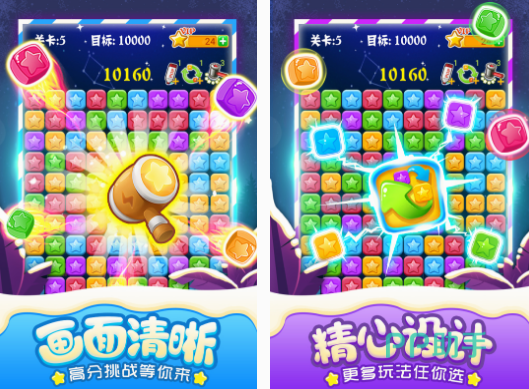 这款以消灭星星游戏所进行设计的全新版本,你可看到依旧沿用了经典的玩法,当然在画面这方面又进行了全面的升级。需要在合作过程中,利用拖动方块,满足一横或者是一列,就可进行消除。融入了超多的关卡,让你享受童年的欢乐,又增加了障碍玩法,相对于比较经典的会有很多的障碍元素,又增加了游戏的难度。
