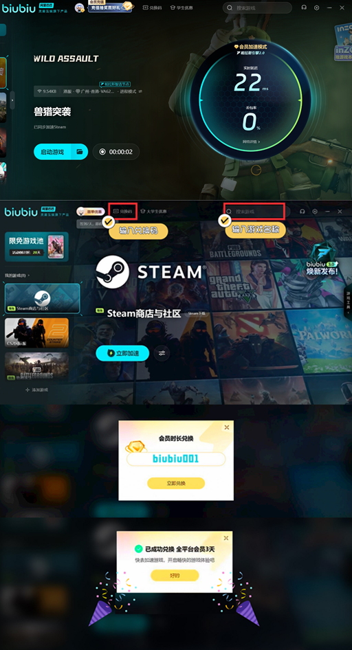 除了这些问题之外,闪退卡顿延迟的出现和网络的稳定性也有关系,要想保证网络的顺畅,不如就选择一个加速器。biubiu加速器拥有一键加速的作用,能避免这些问题,现在还有免费加速时长可以领取,新老用户都不要错过。每一个用户都可以使用兑换码【biubiu001】得到一个长达72小时的免费加速时长。新手用户还有一个3小时的新手礼包,如果能够结合在一起使用,就能免费75小时。