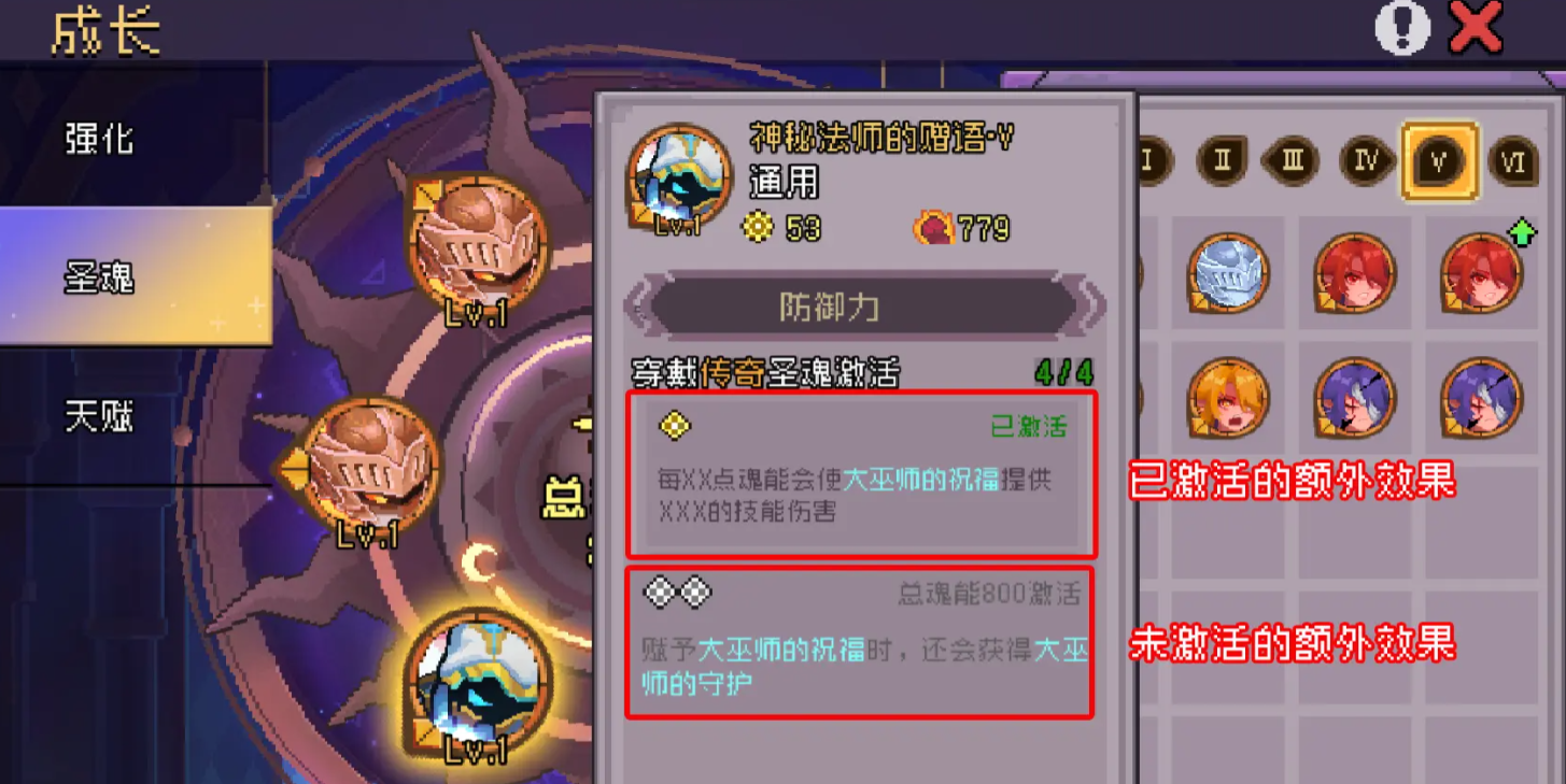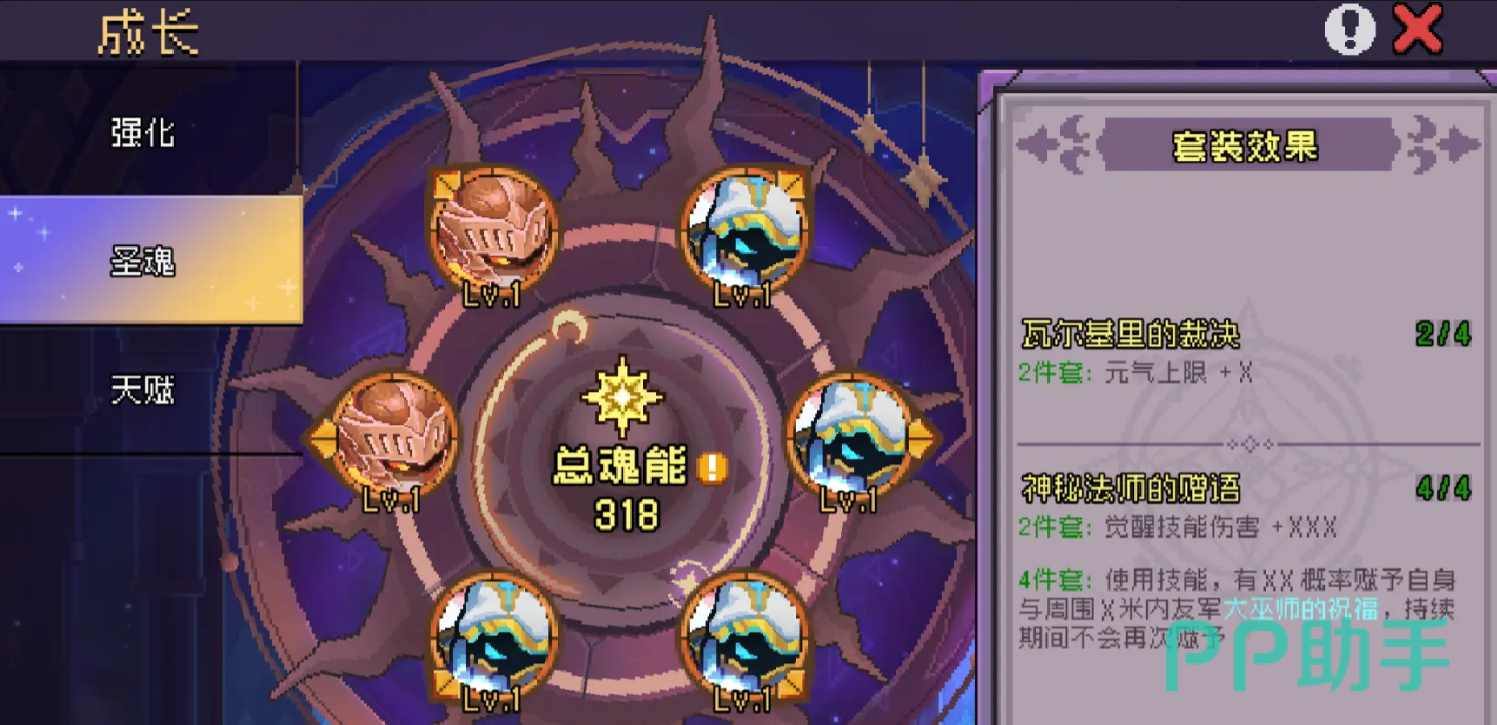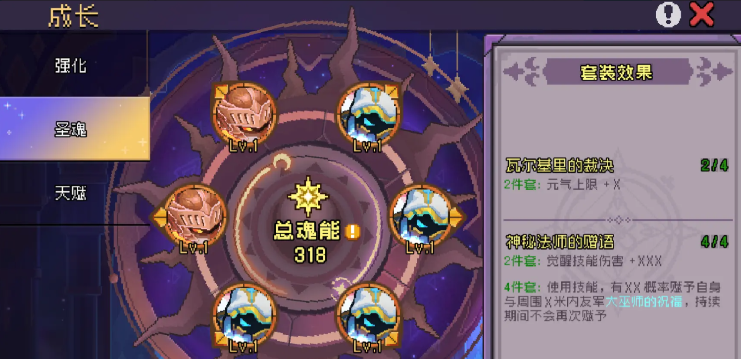 每个圣魂均携带一定数值的魂能,装配后会累计至角色的总魂能值。总魂能不仅受圣魂自身影响,还会受到当前穿戴装备的锻造等级和品质加成。若装配两个或四个名称相同的圣魂(即同一系列),即可激活对应的套装效果。例如,“神秘法师的赠语”两件套可提升觉醒技能的伤害输出,四件套则在释放技能时有一定几率为自身及队友施加祝福状态。