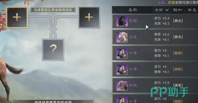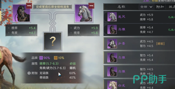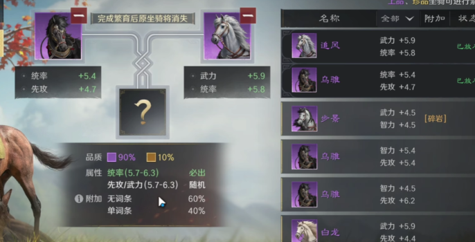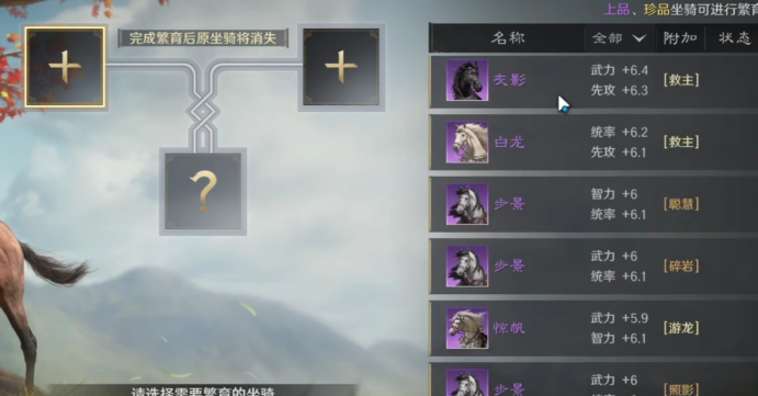 最后,玩家也可以通过马匹繁育的方式,来获取新的马匹,但是建议玩家使用同品质马匹进行繁育,例如上品和上品进行繁育,亦或是珍品和珍品进行繁育,珍品马匹繁育之后,有可能会获取绝世马匹,但是马匹在一段时间内,只能够繁育一次。