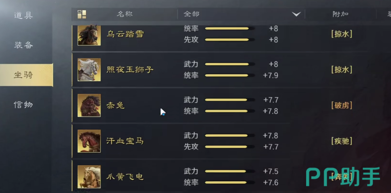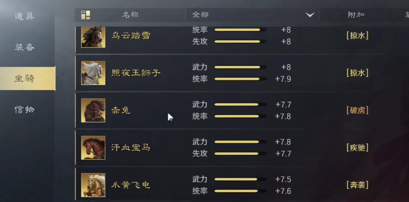 坐骑在游戏当中的品阶有4种类型,他们分别是良品、上品、珍品、绝世,品质越高的马匹,其特技和属性值也就越强,玩家可以将高属性的马匹,例如赤兔马,直接装配给游戏阵列当中的强力英雄。