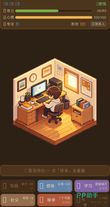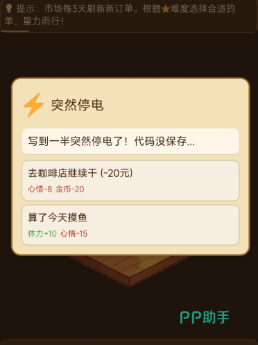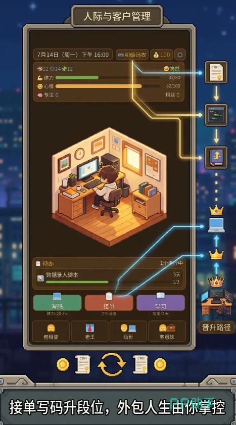 区别于传统挂机类模拟游戏,《外包人生》强调决策权重与长期规划价值。每一次加班节奏设定、每一轮技术学习方向选择、每一笔预算分配方案,都会直接影响健康值、专注力、客户信任度及市场口碑四项核心指标。系统会实时反馈状态变化,使成长过程可视化、可验证、可追溯。