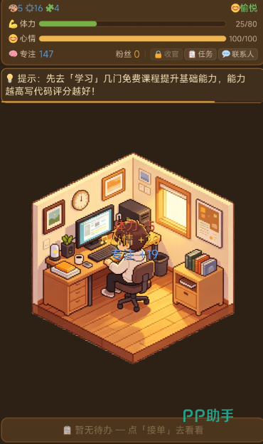 本作采用沉浸式单人叙事结构,所有交互均围绕“接单—开发—交付—复盘”闭环展开。初始阶段仅配备基础电脑与简陋工位,随着订单完成率提升、编程语言掌握度增加以及客户评分累积,玩家可逐步购置高性能设备、租用更大办公空间、雇佣助理协助测试,并解锁AI辅助编码、全栈开发、架构设计等高阶技能模块。
